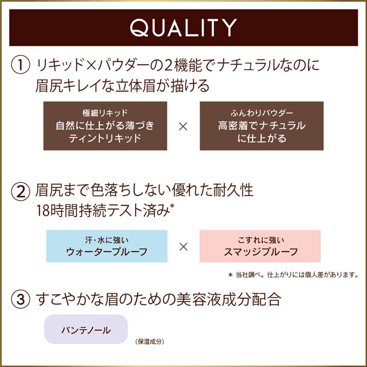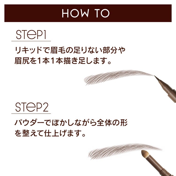 リキッドで眉毛の足りない部分や眉尻を描き足します。次にパウダーでぼかしながら全体の形を整えて仕上げます。