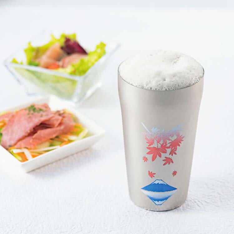●秋の風物詩の紅葉と、水面に映る逆さ富士の柄をあしらった心和むタンブラー。