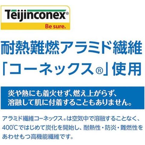●アラミド繊維コーネックスは空気中で溶融することなく400度ではじめて炭化を開始し、耐熱性・難燃性をあわせもつ高機能繊維です。