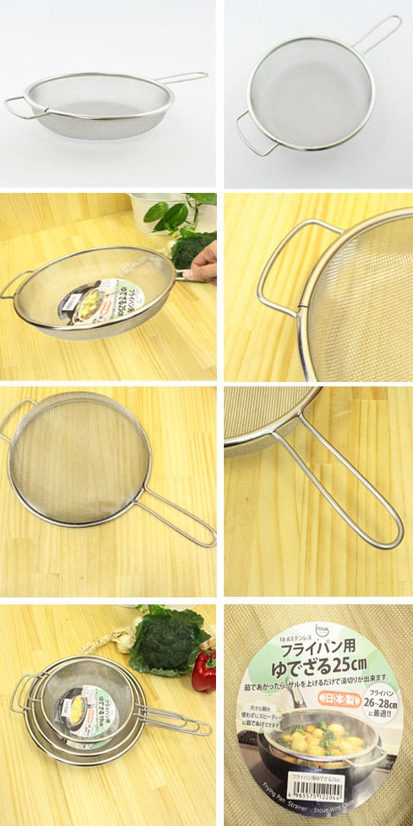 ●業務用ステンレスざる専用メーカーのこだわりでつくったフライパン用ゆでざるです。