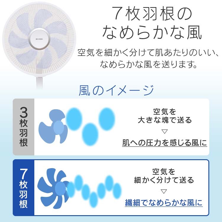 ●7枚羽根が空気を細かく分け、肌あたりのいい、なめらかな風を送ります。