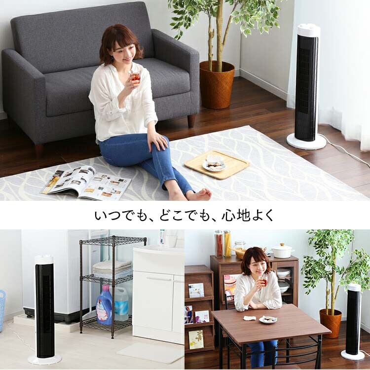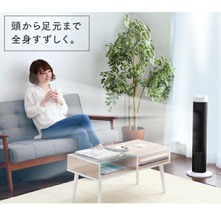 ●省スペースで広範囲に送風ができるタワーファン。高さのある風で全身に風が届くので、頭から足元まで涼しく快適♪左右首振り機能付きで、お部屋全体に風をお届けします。羽根が無いので、小さなお子様がいるご家庭でも安心して使えます。