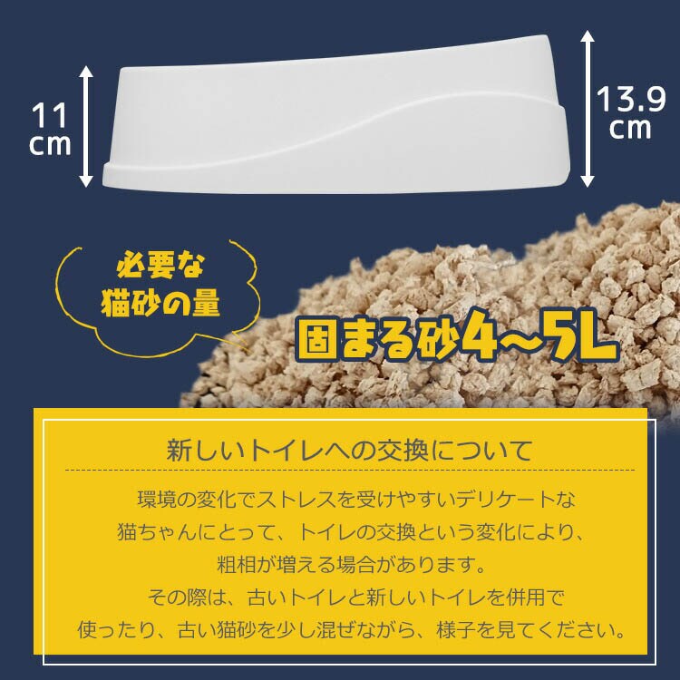 | ・商品サイズ(cm) 幅約38.5×奥行約43.9×高さ約11~13.9 ・商品重量 約0.57g ・猫砂使用量(目安) 固まるネコ砂4~5L ・主要材質 ポリプロピレン |