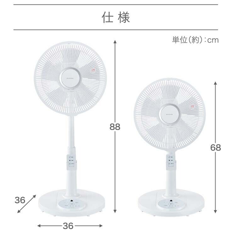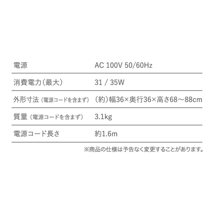 | ・電源 AC100V 50/60Hz ・消費電力 最大:31/35W 待機時:0.1W ・風量調節 4段階(弱/中/強/リズム) ・商品サイズ(cm) 幅約36×奥行約36×高さ約68~88(電源コード含まず) ・質量 約3.1kg(電源コードを含む) ・高さ調節 約68~88cm ・切タイマー 1/2/4/6h ・首振り ・電源コード長さ 約1.6m ・付属品 リモコン×1、電池(CR2032)×1、リモコンホルダー×1 |