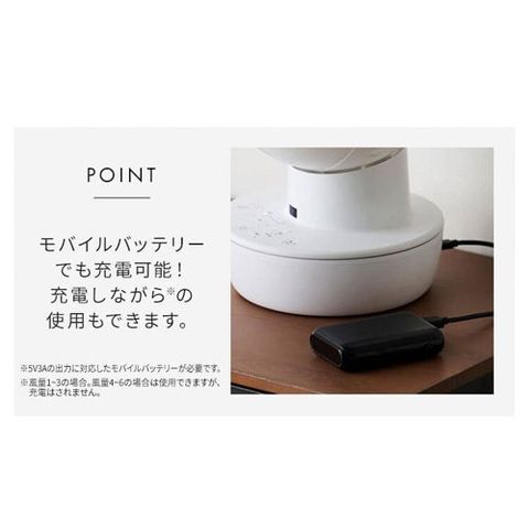 | ・充電電源 5V3Aの出力に対応したUSBアダプター、モバイルバッテリーなど ・充電時間(※1) 約4時間 ・運転時間(※1) 最大:約50時間(風量1、首ふりなし時) 最小:約3時間(風量ターボ、首ふりあり時) ・定格入力 DC 5V3A ・定格消費電力 12W(風量ターボ、首ふりあり時) ・適用床面積目安(※2) 約20畳(風量ターボ) ・製品サイズ(cm) 幅約21×奥行約21×高さ約31.8(Type-Cケーブル、USBアダプター含まず) ・製品質量 約1.4kg ・内蔵バッテリー 種類:リチウムイオン2次電池 容量:2200mAh 定格電圧:DC 14.8V バッテリー寿命:繰り返し充電約500回 (※バッテリーの寿命は、周囲の温度や使用頻度などの環境や条件によって変わります。) ・付属品 リモコン、Type-Cケーブル(専用)、USBアダプター(専用) ・付属Type-Cケーブル 長さ:約1.5m ・付属USBアダプター 電源入力:AC100-240V、50/60Hz 出力:DC 5V3A |