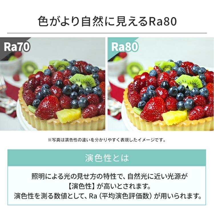 ●色がより自然に見える「演出性:Ra80」:照明による光の見せ方の特性で、自然に近い光源が「演出性」が高いとされます。演出性を測る数値として、Ra(平均演色評価数)が用いられます。