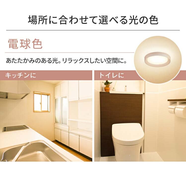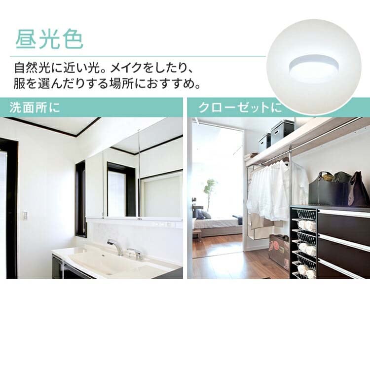 ・電球色:あたたかみのある光で、リラックスしたい空間に。・昼光色:自然光に近い光で、メイクや服を選んだりする場所におすすめ。
