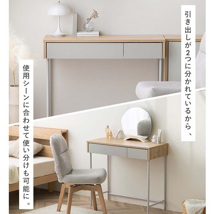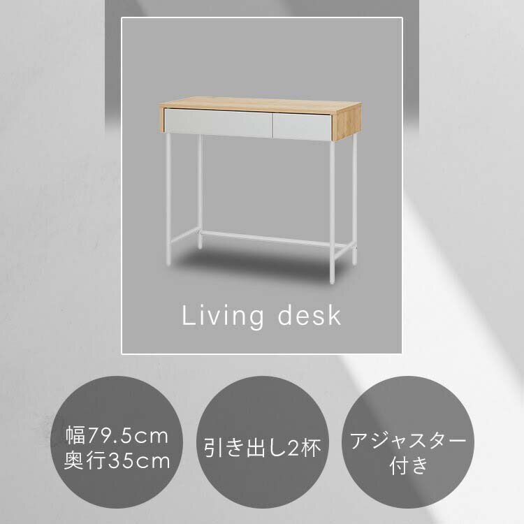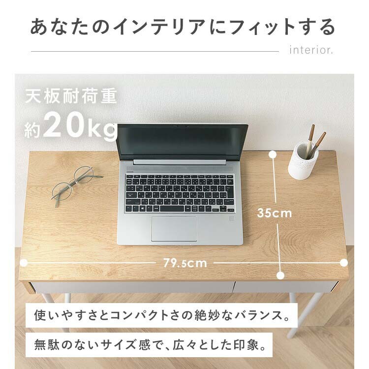 | ・商品サイズ(cm):製品外寸:幅約79.5×奥行約35.0×高さ約71.1、引き出し内寸(大):幅約44.9×奥行約28.2×高さ約4.5、引き出し内寸(小):幅約20.0×奥行約28.2×高さ約4.5 ・耐荷重(約):天板:20kg、引き出し(大):2kg、引き出し(小):2kg、全体:24kg ・主要材質:木製部分:合成樹脂化粧パーティクルボード(メラミン樹脂)、プリント紙化粧パーティクルボード、プリント紙化粧繊維板、金属部分:金属(鋼)(エポキシ樹脂塗装) ・必要工具:+ドライバー(サイズ:2番) 注意:電動ドライバーの使用可 ※耐荷重は測定値であり、保証値ではありません。 |