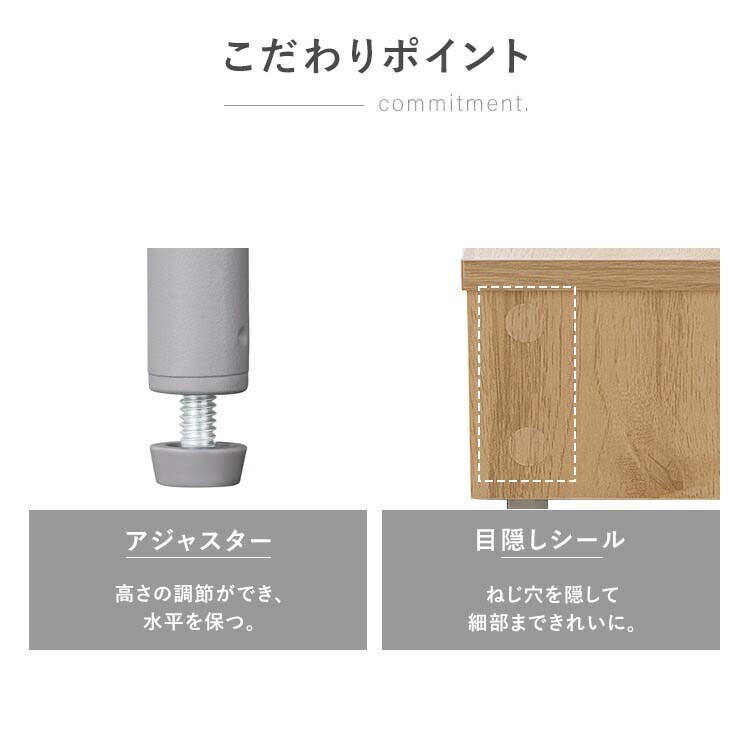 ●こだわりポイント:アジャスター:高さの調節ができ、水平を保つ。目隠しシール:ねじ穴を隠して細部まできれいに。