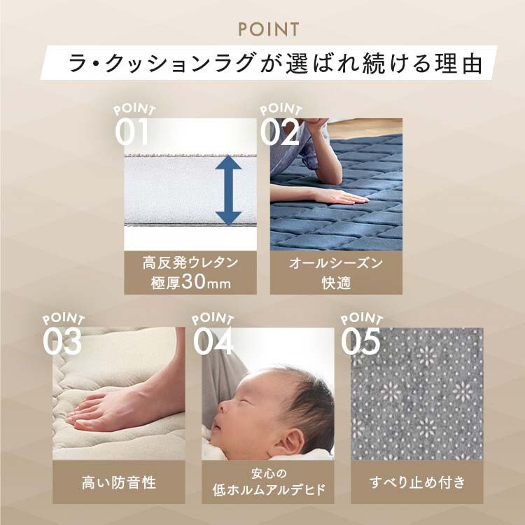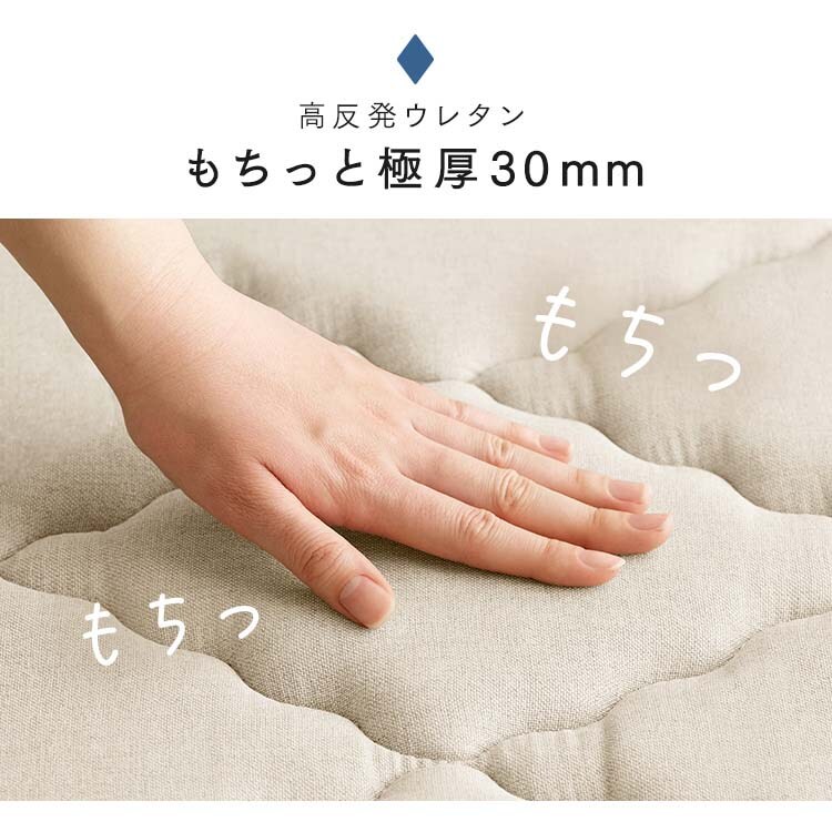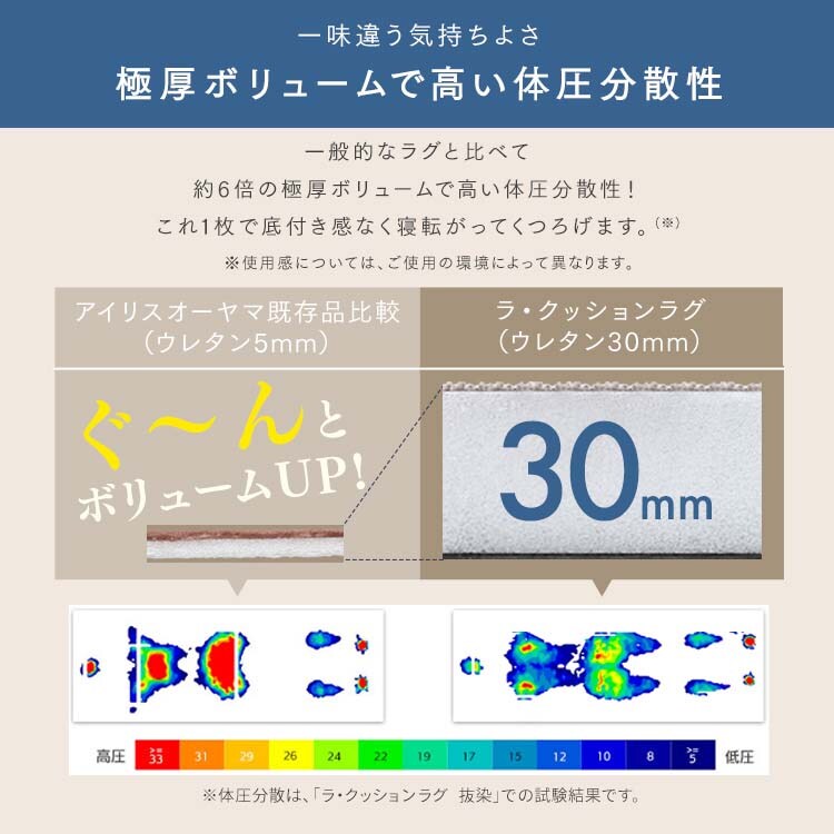 ●夏はさらっとした生地の触り心地が気持ちよく、冬は極厚ウレタンで底付きしにくく、あたたかさを感じられるラグ。