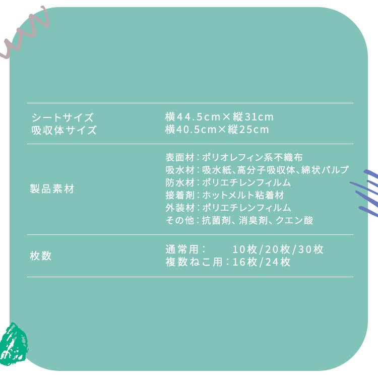 | ★製品素材 表面材:ポリオレフィン系不織布 吸水材:吸水紙、高分子吸収体、綿状パルプ 防水材:ポリエチレンフィルム 接着剤:ホットメルト粘着材 外装材:ポリエチレンフィルム その他:抗菌剤、消臭剤、クエン酸 ★製品サイズ(cm) シートサイズ:約44.5×約31、吸収体サイズ:約40.5×約25 ★消臭シート交換の目安 (複数ねこ用) 愛猫2匹:約1週間 愛猫3匹:約4~5日 愛猫4匹:約3~4日 ×愛猫の状態(体調・体重・年齢など)や季節により、交換の時期は異なります。 ×製品によりシートサイズが合わない場合があります。 お使いのトイレサイズをご確認の上ご購入ください。 |