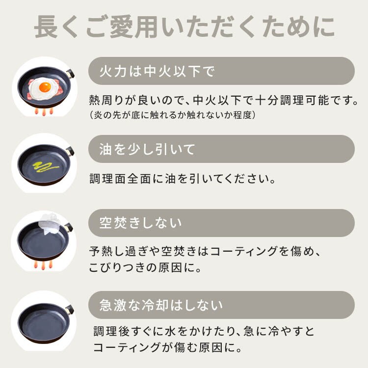 ●食材がくっつきにくいフッ素コーティングで、いつまでもするんっと気持ちいい使い心地。