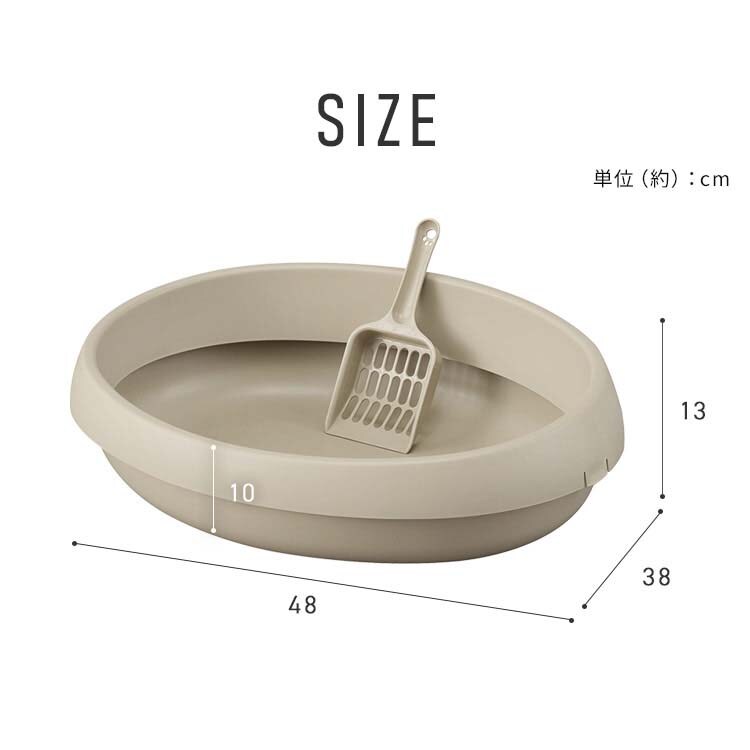 | ・製品サイズ(cm):幅約48×奥行約38×高さ約13 ・製品質量:約637g ・材質:ポリプロピレン ・付属品:スコップ ※猫砂は付属しません。 |