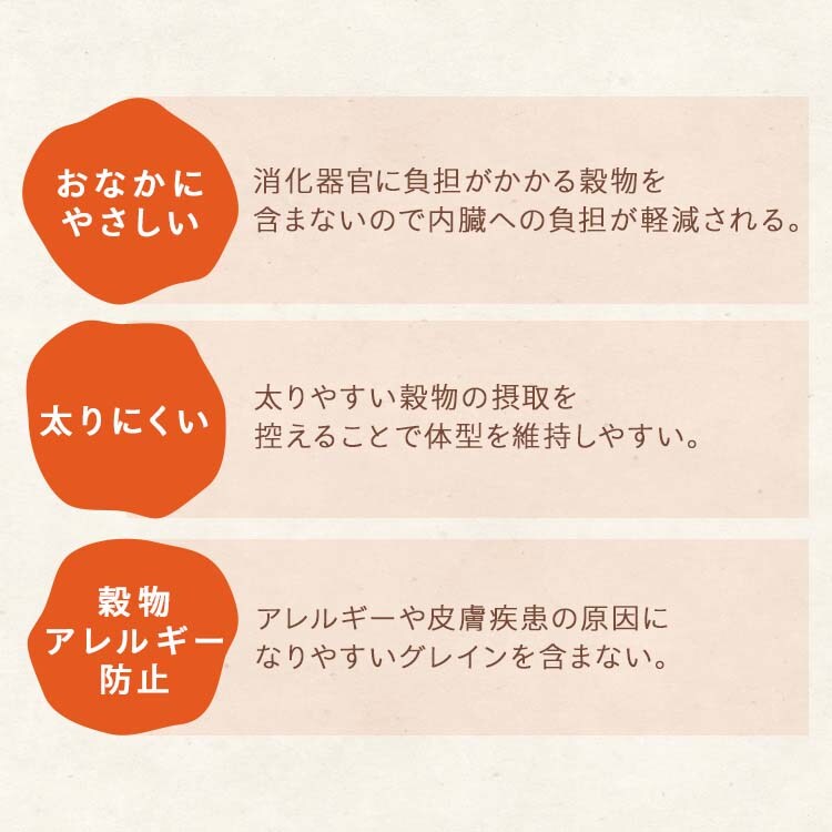 ●グレインフリーでワンちゃんの健康をサポート:グレインフリーとは穀物(小麦・とうもろこし・米などの穀物全般)を含まないフード。愛犬の健康な体が維持できるように考えられたフードです。