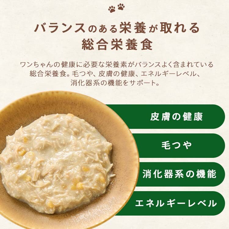 ●バランスのある栄養が取れる総合栄養食:ワンちゃんの健康に必要な栄養素がバランスよく含まれている総合栄養食。毛艶、皮膚の健康維持、エネルギーレベル、消化器系の健康維持をサポート。