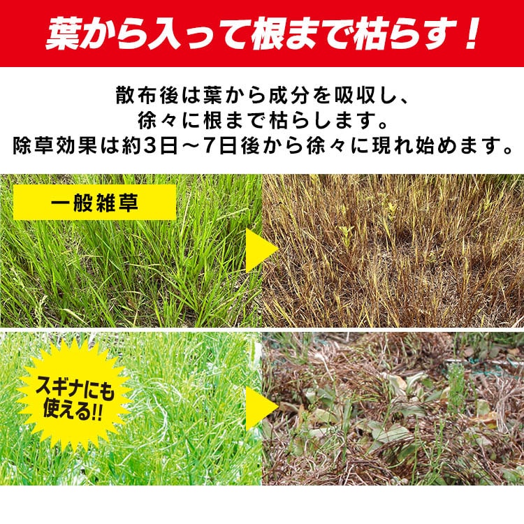 ●散布後は葉から成分を吸収し、徐々に根まで枯らします。1~2週間そのままにしてください。