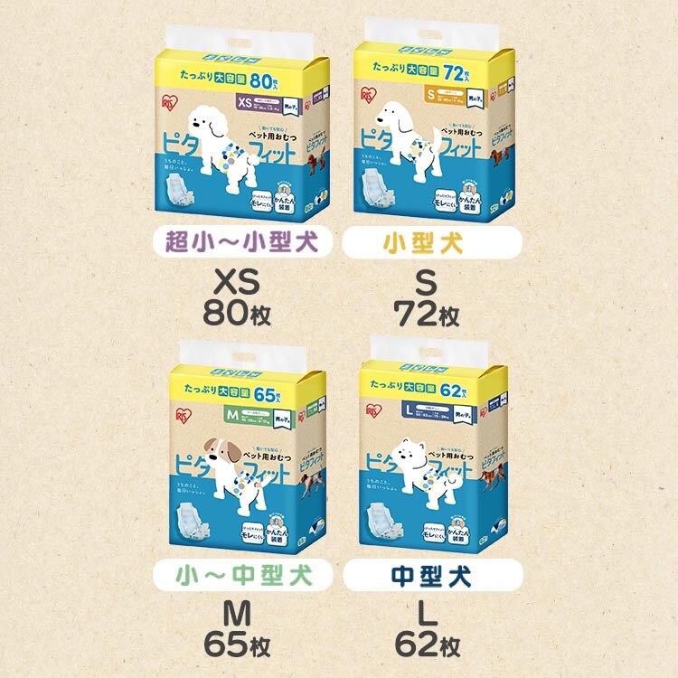 | ★枚数 S:1袋(72枚) ★品名 オス犬用オシッコ専用紙おむつ ★素材 表面材:ポリオレフィン・ポリエステル不織布 吸水材:綿状パルプ、高分子吸水材、吸収紙 防水材:ポリエチレンフィルム 止着材:ポリオレフィン 伸縮材:ポリウレタン 結合材:スチレン系エラストマー合成樹脂 ★対象 オス犬 ★適応サイズの目安(オスの場合) サイズ:胴まわり/体重 S:23~40cm/4~8kg ★適応犬種(参考標準体型)※オスの場合 S:ポメラニアン、マルチーズ、トイ・ブードル、ミニチュア・ダックスフンド、シーズーなど ※サイズに対する犬種はあくまでも目安です。 愛犬のサイズを必ず確認のうえ、ご使用ください。 |
