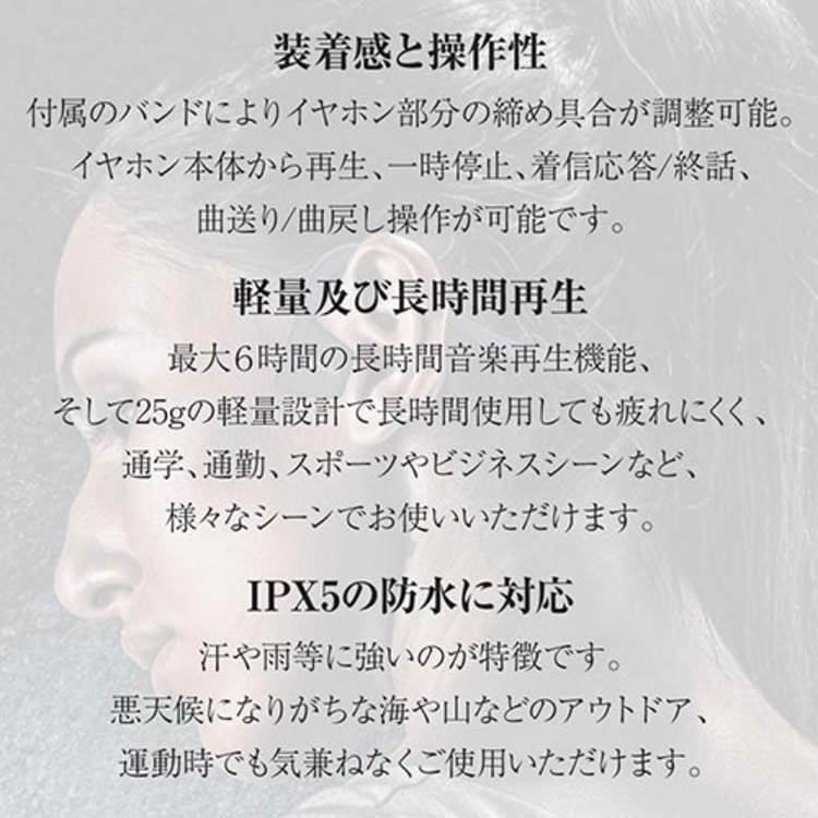 ●骨の振動で音を伝えるため耳を塞がず外音の取り込みが可能、音楽や通話を楽しみながら周囲の音もしっかり聞くことが出来ます。