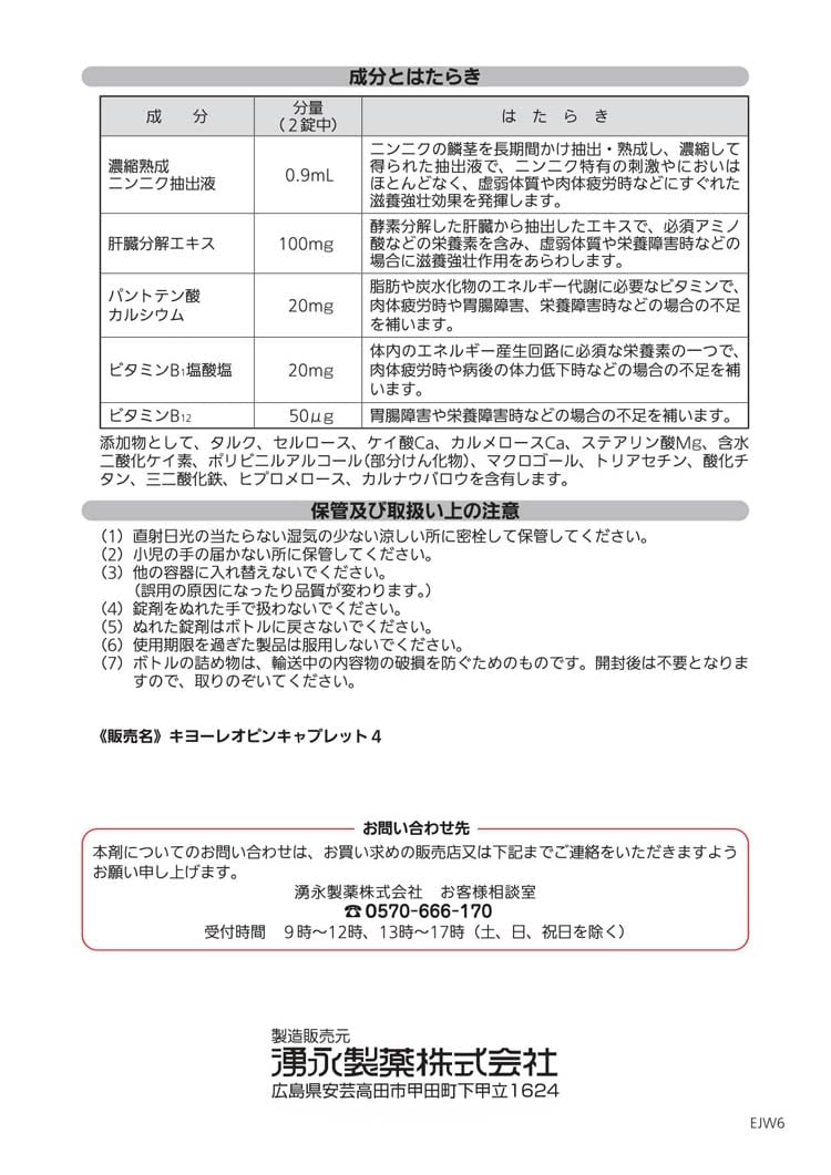●キヨーレオピンキャプレット4は、ニンニクを長期間かけ抽出・熟成し、濃縮して得られた濃縮熟成ニンニク抽出液に、肝臓分解エキス、パントテン酸カルシウム、ビタミンB1及びビタミンB12を配合した滋養強壮剤です。