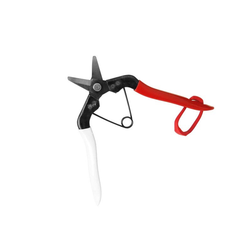 果樹などの収穫にお使いいただく鋏です。小指にはめていただき、作業時の落下を防ぐループ付です。高級刃物鋼を材料とし、刃持ちと切れ味を発揮します。柑橘を傷つけないよう刃の先が反っています。作業性の良いバネ付です。