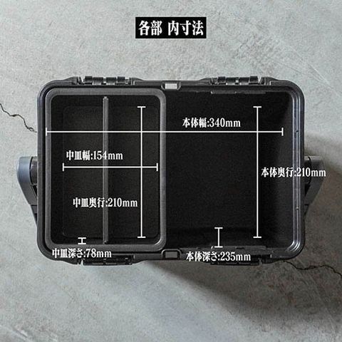 | ・高耐衝撃性コーポリマー樹脂 ・容量:17L ・本体内寸法:約W340×H235(中皿使用時H160)×D210mm ・中皿内寸法:約W154×H210×D78mm ・耐荷重:627kgf ・ハンドル引張強度:120kgf ・保証期間:初期不良対応 ・生産国:日本 |