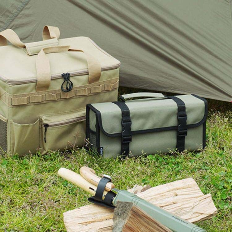 ●ヘッドライトや小型LEDランタン、カトラリーなど散らかりがちな小物をすっきりと収納。ペグハンマーや30ペグの収納に。内寸約33でペグハンマーや30ペグの収納にピッタリ。底面・側面・天面が補強されており、鍛造ペグを入れても型崩れしない。