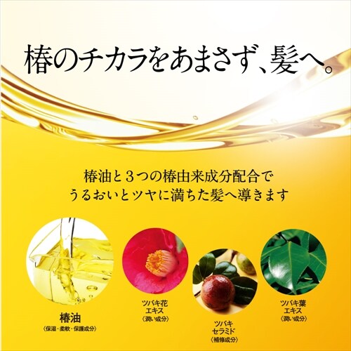 ※椿油(保湿・柔軟・保護成分)、ツバキセラミド(補修成分)、ツバキ花エキス(潤い成分)、ツバキ葉エキス(潤い成分)。