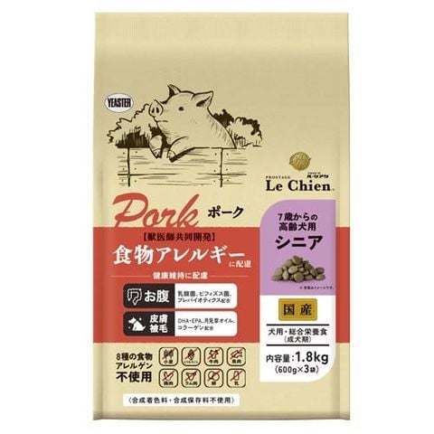 ●愛犬の食物アレルギーに配慮し、食物アレルギーの原因になりにくいとされるポークとお米を主原料としたプレミアムドッグフード。