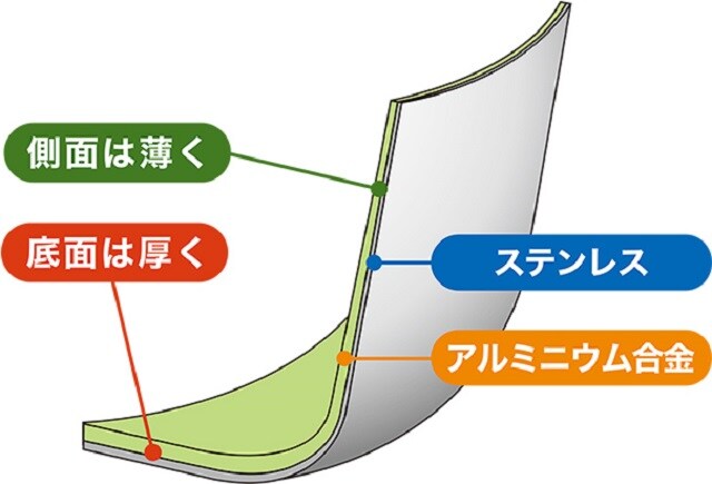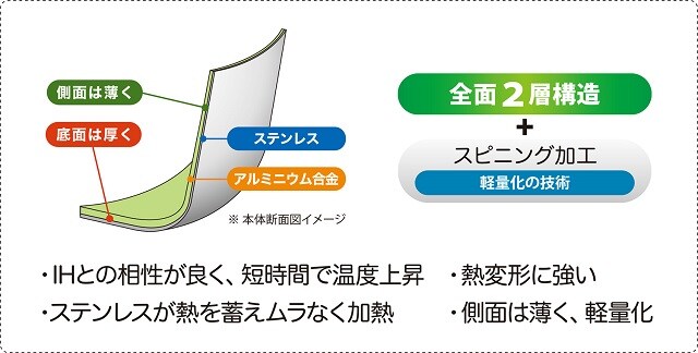 本体は電磁調理器に適した全面2層クラッド材(ステンレス-アルミ複合材)を採用。