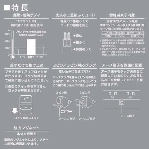| ★最大消費電力合計:1500W ★コンセント:6個口 ★プラグ形状:2ピン/3ピン対応プラグ ★コード長:2m ★バリスタ電圧:390V、制限電圧:650V、最大サージ電圧:6000V |