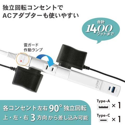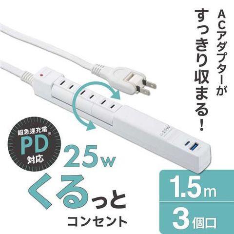 【回転スリムタップ雷ガード付きPD対応25W3個口1.5m HS-T3RU1C1KF-の商品詳細】