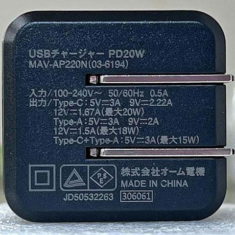 | 定格入力:AC100-240V 50/60Hz 0.5A 定格出力: Type-C:DC5V/3A、DC9V/2.22A、DC12V/1.67A(最大20W) Type-A:DC5V/3A、DC9V/2A、DC12V/1.5A(最大18W) Type-C+Type-A:DC5V/3A(最大15W) 接続端子:USB Type-C(USB Power Delivery対応)、USB Type-A(Quick Charge 3.0対応) 外形寸法:幅37*高さ39*奥行43mm(プラグ収納時・突起物除く) 質量:約51g |