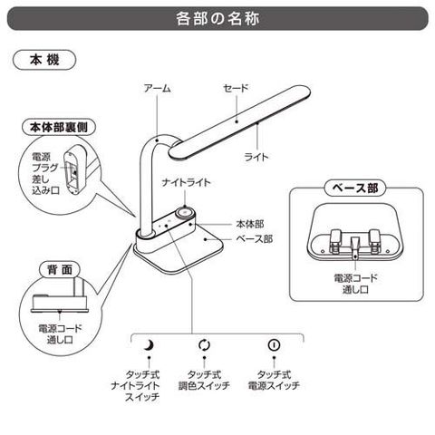 | 用途:学習・読書/仕事・精密作業 定格:DC24V 0.75A 消費電力:14W(100%点灯時) 使用光源:チップ型LED(交換不可) 色温度:(約)2700~6500K 全光束:電球色・・・約775ルーメン(100%点灯時/約2700K)、白色・・・約825ルーメン(100%点灯時/約4200K)、昼光色・・・約900ルーメン(100%点灯時/約6500K) 照度:約2200ルクス(高さ40cm 100%点灯/約4200K) 机上面照度:AA形(JIS C8112:2014)準拠 演色性:Ra95(平均演色評価数) 外形寸法:(約)幅395×高さ400×奥行217mm 質量:約1030g 付属品:専用ACアダプター(コード長:約1.5m)、保証書付取扱説明書 |
