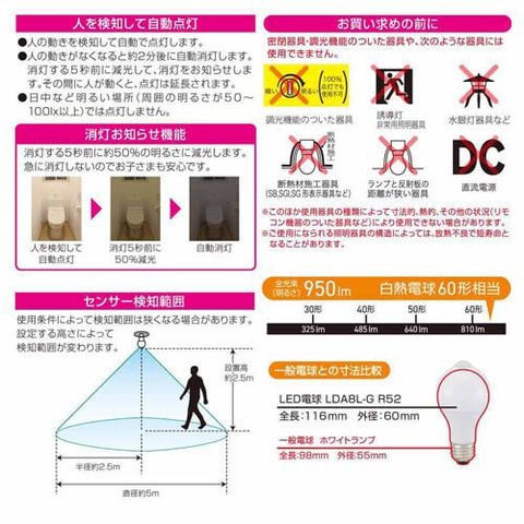 【LED電球 E26 60形相当 人感明暗センサー付き 電球色の商品詳細】