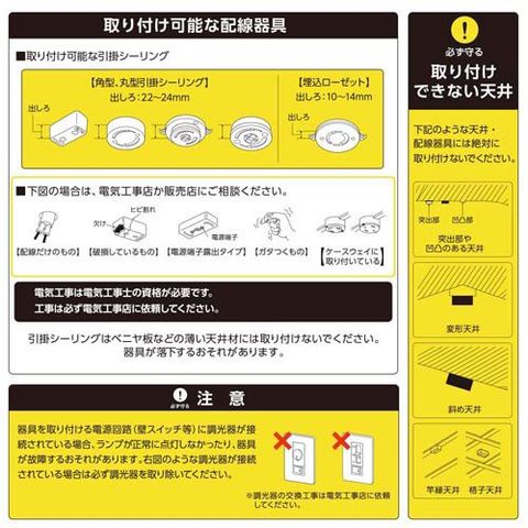 | 電源:AC100V 50/60Hz 消費電力:24.5W(100%点灯時)、11W(50%点灯時)、 0.06W(常夜灯使用時) 使用光源:LED×36灯使用(交換不可)/昼光色 全光束:3100ルーメン(100%点灯時)、1500ルーメン(50%点灯時)、0.8ルーメン(常夜灯使用時) エネルギー消費効率:126.5 lm/W(100%点灯時) 平均演色評価数:Ra80 調光機能:リモコン調光・・・100%ー75%ー50%ー25%ー10%・常夜灯、壁スイッチ調光・・・100%ー50%ー常夜灯 本体寸法:本体・・・(約)φ380×高さ75mm(プラグ・スポンジ除く)、リモコン・・・(約)幅35×高さ142×奥行17mm 質量:本体・・・約755g、リモコン・・・約39g(乾電池を除く) リモコン使用範囲:約5m 乾電池の寿命(リモコン):約2年(マンガン乾電池で1日10回使用の場合) 付属品:リモコン(電池別売)、保証書付取扱説明書 保証期間(お買い上げの日から):5年間(LED器具の点灯装置)、1年間(セード・リモコン) |