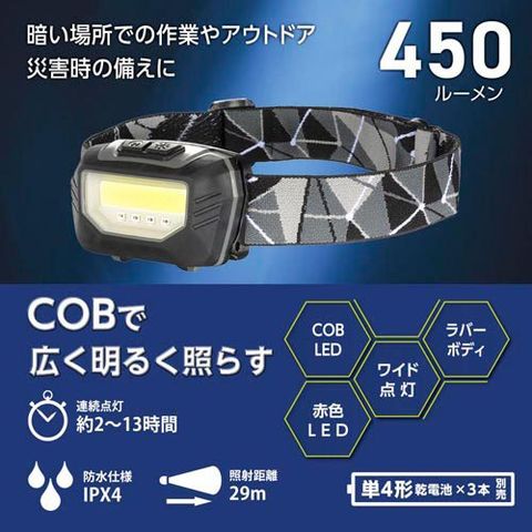 連続点灯時間:HIGHモード・・・約2時間、LOWモード・・・約13時間、赤色点灯モード・・・約33時間 ※未使用・新品アルカリ乾電池使用時、電池の性能や使用状況により異なります。