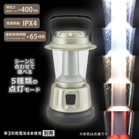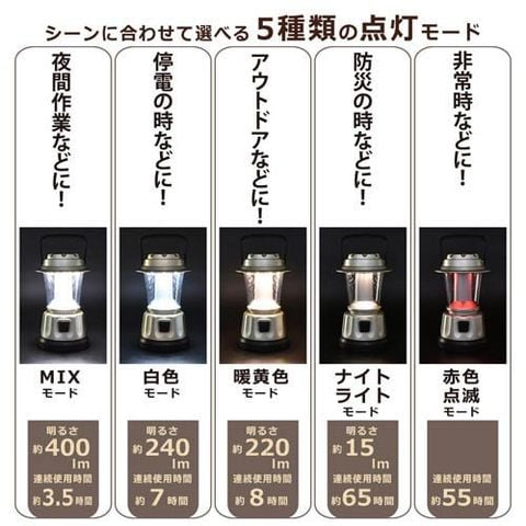 ・光束:約400 lm(MIXモード)、約240 lm(白色モード)、約220 lm(暖黄色モード)、約15 lm(ナイトライトモード)