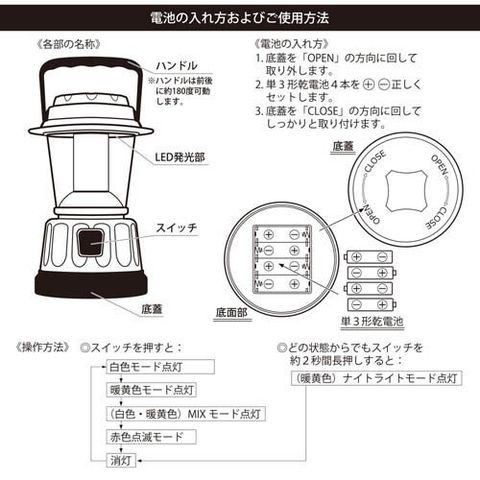・連続使用時間:約3.5時間(白色・暖黄色/MIX モード)、約7時間(白色モード)、約8時間(暖黄色モード)、約65時間(暖黄色/ ナイトライトモード)、約55時間(赤色点滅モード)※明るさ10%まで