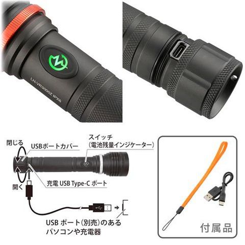 | 電源方式:充電式(充電池内蔵) 内蔵充電池:リチウムイオン電池 3.7V 2500mAh(電池交換不可) 連続使用時間:明るさ10%まで ・約2時間・・・HIGH(ハイ)モード ・約4時間・・・MIDDLE(ミドル)モード ・約15時間・・・LOW(ロー)モード ・約6時間・・・点滅(フラッシュ)モード 充電時間:約2時間 光源:白色系LED(LED交換不可) 最大光束:約3000 lm(ルーメン) 保護等級:IPX6(防浸形)※暴噴流に対して保護する。あらゆる方向からのノズルによる強力なジェット噴流水によっても有害な影響を及ぼしてはならない。(JISC0920:2003による。) 外形寸法:(約)直径52×長さ232mm 質量:約344g 付属品:USBケーブル、ストラップ |