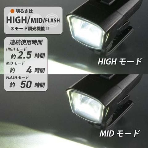●明るさはHIGH/MID/FLASHの3モード調光機能付き