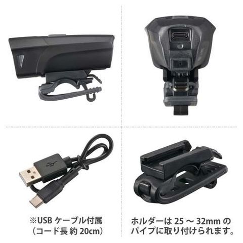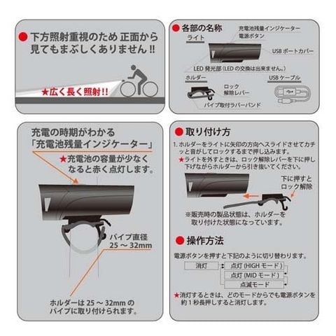 | ・電源方式:充電式(充電池内蔵) ・内蔵充電池:リチウムイオン電池 3.7V 1200mAh(電池交換不可) ・連続使用時間:HIGH(ハイ)モード・・・約2.5時間、MID(ミドル)モード・・・約4時間、FLASH(点滅)モード・・・約50時間 ・光源:白色系LED1個(LED交換不可) ・光束:約500lm/HIGHモード、約300lm/MIDモード (満充電時、簡易的に本体照明部分を積分球に入れ満充電で実測した数値) ・中心光度:約3200cd/HIGHモード ・保護等級:IPX5(防噴流形) ※噴流に対して保護する。あらゆる方向からのノズルによる噴流水による有害な影響を及ぼしてはならない。(JIS C 0920:2003による。) ・取付バンド径:取付可能範囲直径 約25~32mm ・本体質量:約81g(付属品除く) ・外形寸法:(約)幅46×高さ36×奥行91mm(付属品除く) |