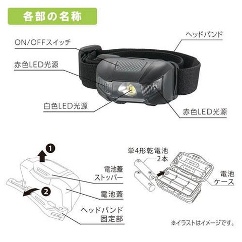 | ・電源:単4形乾電池2本(別売) ・光源:白色系LED1個(交換不可)、赤色系LED2個(交換不可) ・光束:HIGHモード:約110lm(ルーメン)、LOWモード:約50lm(ルーメン) ・連続点灯時間:HIGHモード:約2.5時間、LOWモード:約5時間、赤色点灯モード:約9時間 ・照射距離:約44m ・保護等級:IPX4※JIS/IEC保護等級(JISC0920:2003):水の飛まつに対して保護する(定義:あらゆる方向からの水の飛まつによっても有害な影響を及ぼしてはならない。 ・質量:約40g(電池別) ・外形寸法:本体:(約)幅58×高さ30×奥行33mm |