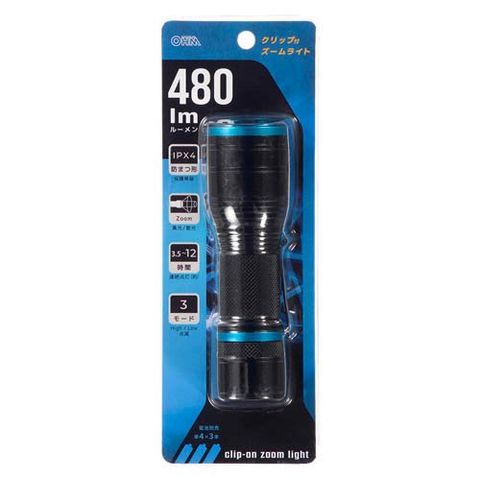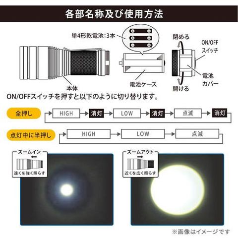 | ・ON/OFFスイッチを押すと以下のように切り替ります。 ・全押し:HIGH→消灯→LOW→消灯→点滅→消灯 ・点灯中に半押し:HIGH→LOW→点滅 ・ズームイン/遠くを強く照らす ・ズームアウト/近くを広く照らす ・電源:単4形乾電池×3本(別売) ・使用光源:白色LED×1個(交換不可) ・光束:High:約480ルーメン/Low:135ルーメン ・連続点灯時間:High:約3.5時間/Low:約12時間 ・照射距離:約65m(Highモード集光時) ・保護等級:IPX4 ※JIS保護等級(JIS C0920:2003):あらゆる方向からの水の飛まつによっても有害な影響を及ぼしてはならない。 ・質量:約123g(乾電池別) ・外形寸法:(約)最大径35×長さ121mm |