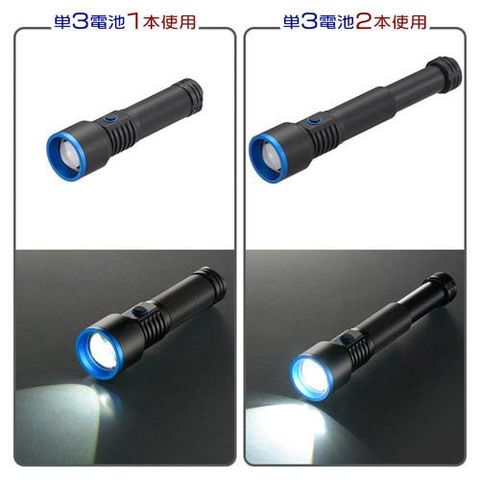 ※乾電池1本で使用する場合、必ず伸び縮み部を縮め、乾電池サイズに合わせてご使用ください。本体を伸ばした状態のまま乾電池1本で使用した場合、ライトは点灯しません。
