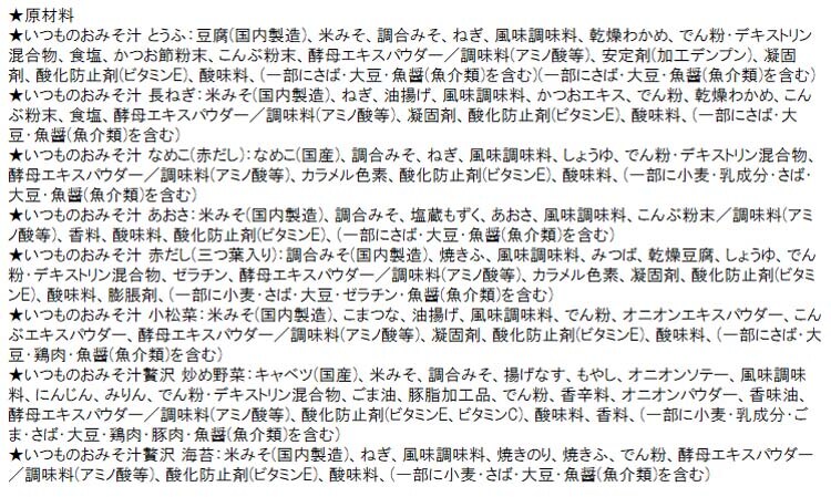| ★いつものおみそ汁 とうふ:さば、大豆、魚介類 ★いつものおみそ汁 長ねぎ:さば、大豆、魚介類 ★いつものおみそ汁 なめこ(赤だし):小麦、乳、さば、大豆、魚介類 ★いつものおみそ汁 あおさ:さば、大豆、魚介類 ★いつものおみそ汁 赤だし(三つ葉入り):小麦、さば、大豆、ゼラチン、魚介類 ★いつものおみそ汁 小松菜:さば、大豆、鶏肉、魚介類 ★いつものおみそ汁贅沢 炒め野菜:小麦、乳、ごま、さば、大豆、鶏肉、豚肉、魚介類 ★いつものおみそ汁贅沢 海苔:小麦、さば、大豆、魚介類 |