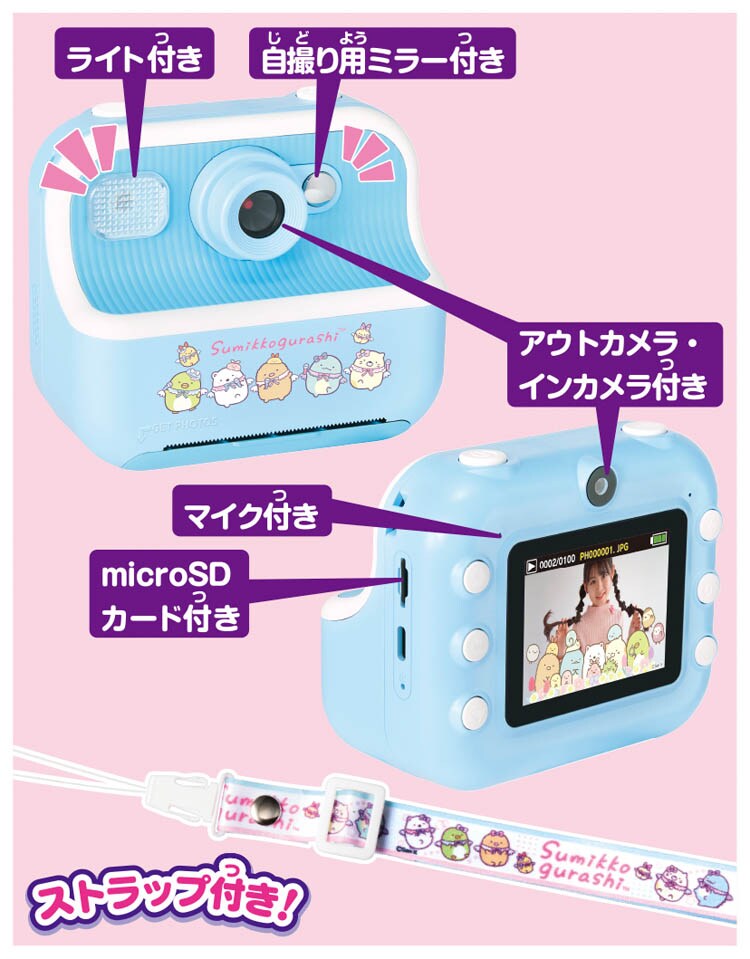 ●すみっコの可愛いフレーム付きで撮影でき、撮影後すぐに白黒写真が印刷されて出てくるカメラです。