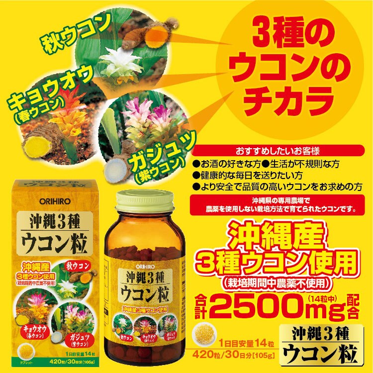 ●秋ウコン、キョウオウ(春ウコン)、ガジュツ(紫ウコン)の3種ウコンを合計2500mg配合(1日量中)。