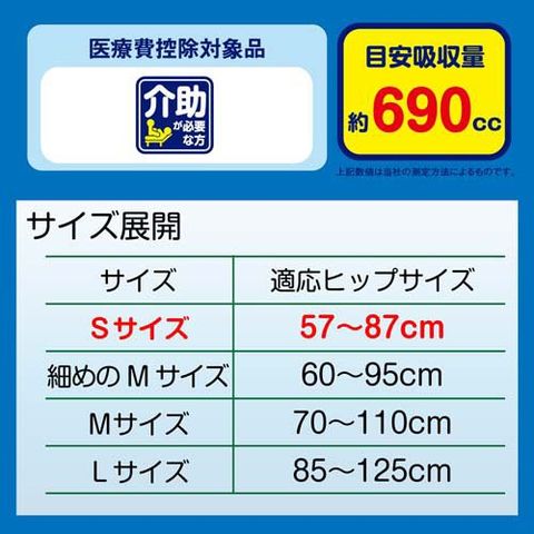 | ヒップサイズ:57~87cm 目安吸収量:約690cc 吸収回数の目安:排尿約4.5回分(1回の排尿量150mlとして) 対象:男女共用 医療費控除対象商品表面材:ポリオレフィン系不織布 吸水材:綿状パルプ/吸収紙/高分子吸水材 防水材:ポリエチレンラミネート不織布 止着材:ポリプロピレン 伸縮材:ポリウレタン 結合材:スチレン系エラストマー合成樹脂 |