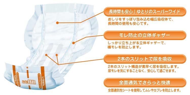 ●お尻をすっぽり包み込む幅広吸収体で、長時間の使用も可能です。