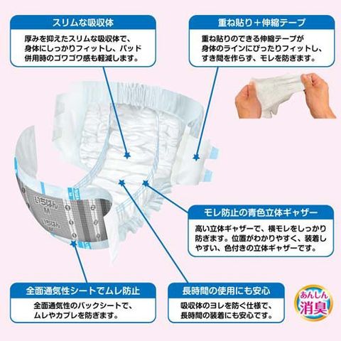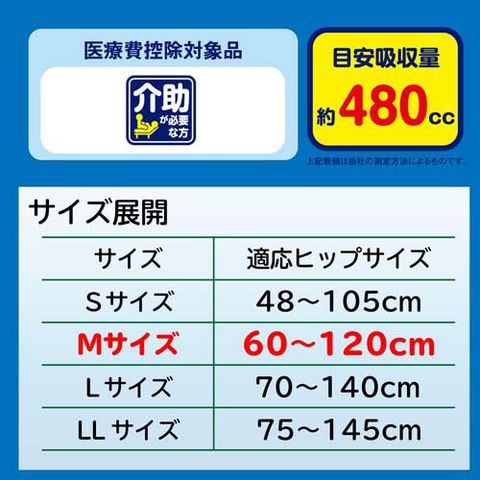 | ヒップサイズ:60~120cm 目安吸収量:約480cc 吸収回数の目安:排尿約3回分(1回の排尿量150mlとして) 対象:男女共用 医療費控除対象商品表面材:ポリオレフィン系不織布 吸水材:綿状パルプ/吸収紙/高分子吸水材 防水材:ポリエチレンラミネート不織布 止着材:ポリプロピレン 伸縮材:ポリウレタン 結合材:スチレン系エラストマー合成樹脂 |